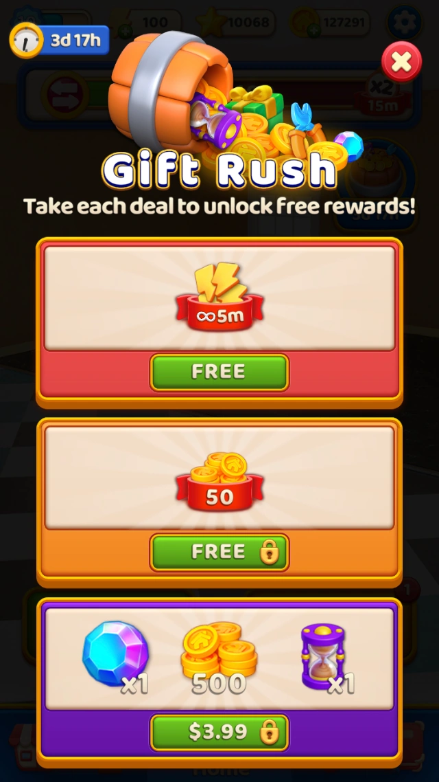 Gift Rush offers you a wide range of in-game items and free rewards. You can get free rewards as you take the deals and gain more!